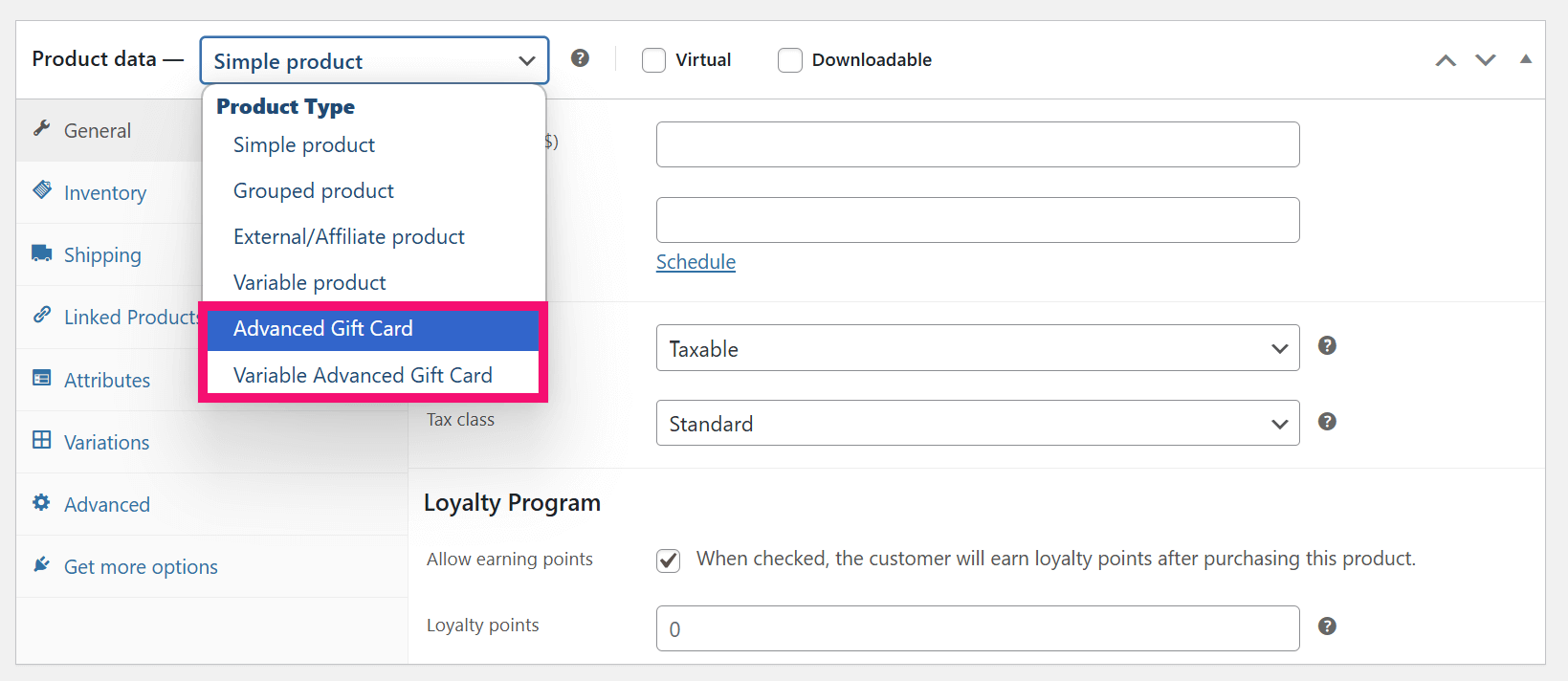 WooCommerce product data panel with dropdown open, highlighting the Advanced Gift Card option while product settings and loyalty program fields display.